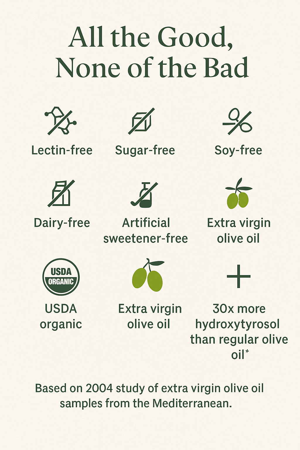 This is why our Polyphenol-Rich Olive Oil stands apart in both taste and quality. With a slightly bold, peppery bite and a deep, robust finish, it reflects the purity and potency inside every bottle. Thanks to our meticulous extraction and refinement process, the result is not only delicious — it's a daily wellness ritual you can truly feel.
